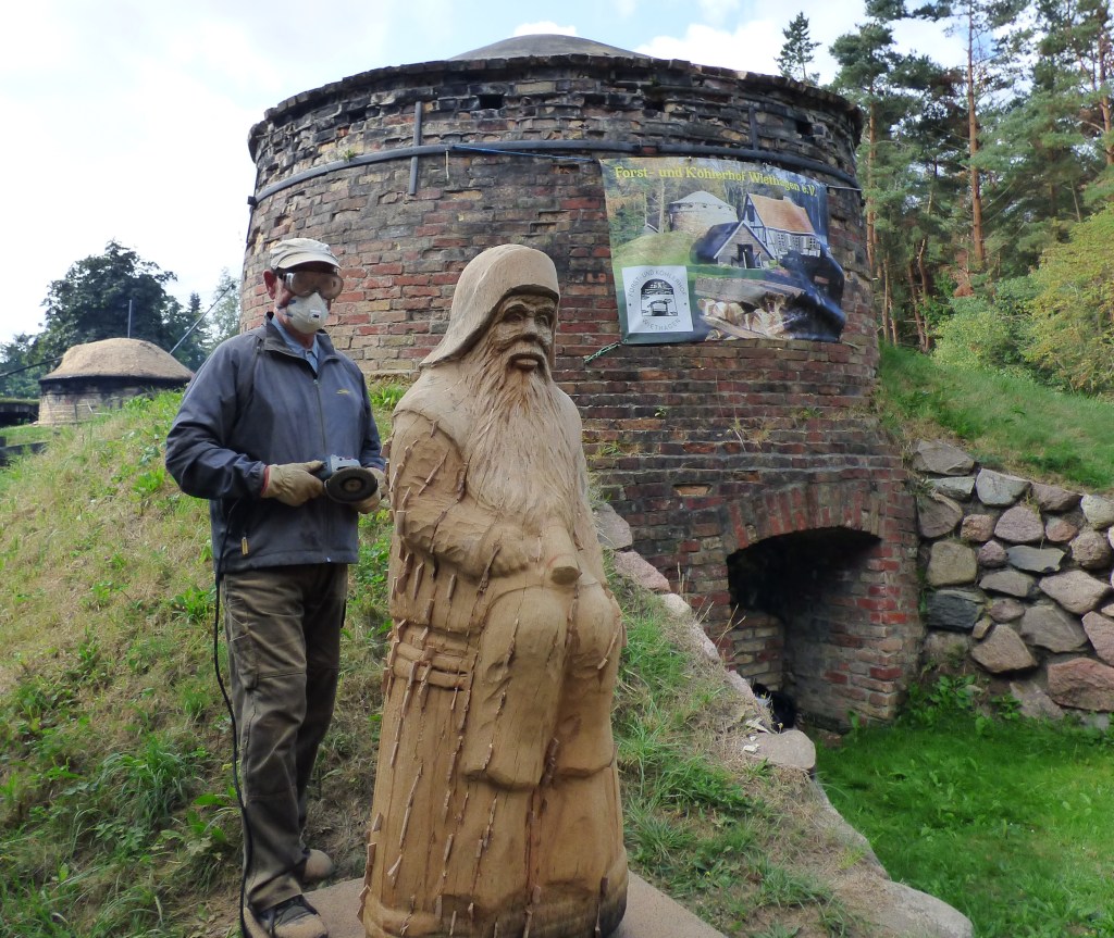 Köhlerhof Wiethagen: Holzbildhauer Harald Wroost fertigt seinen „Klabautermann auf dem Teerfass“